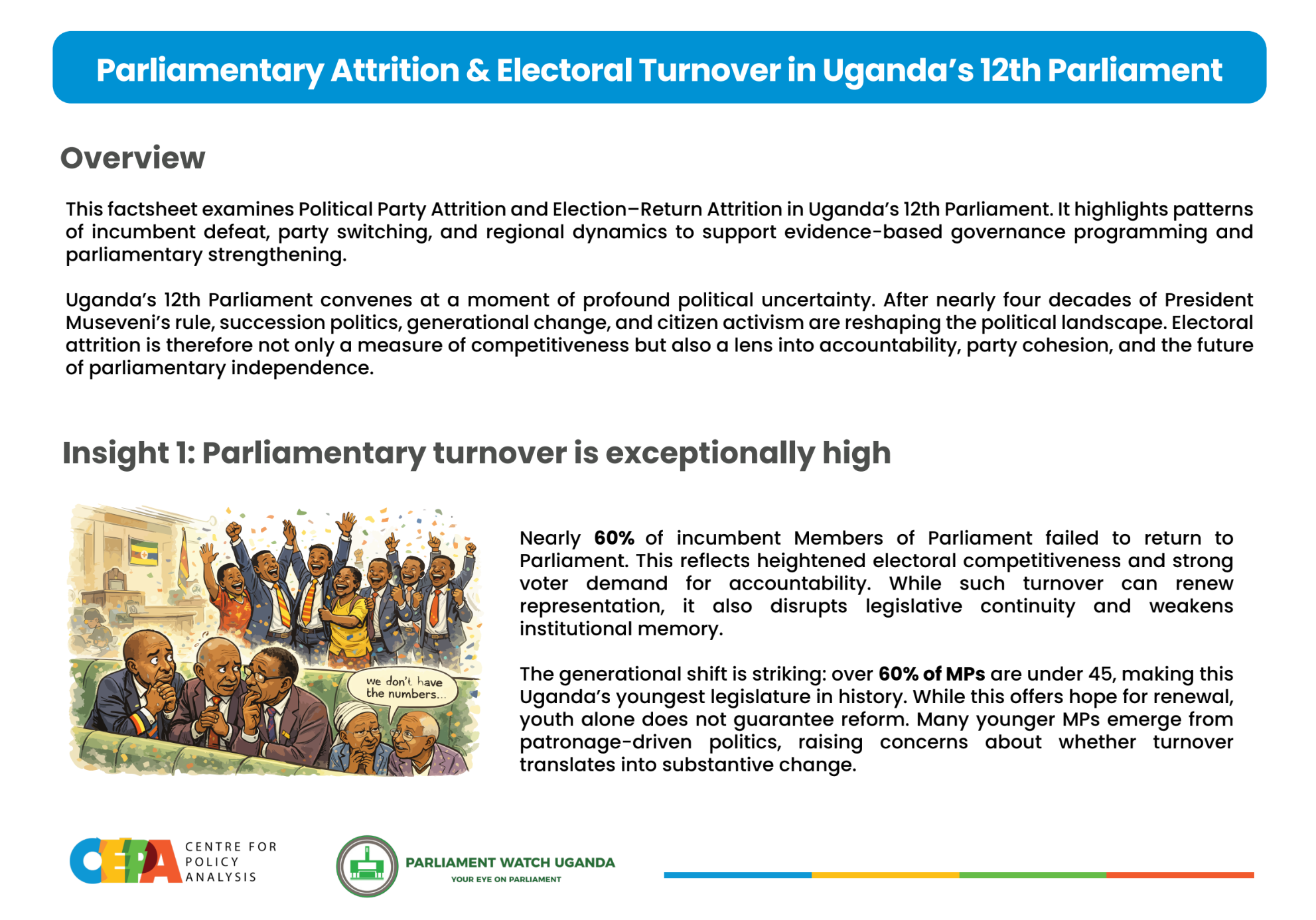 This factsheet examines Political Party Attrition and Election–Return Attrition in Uganda’s 12th Parliament. It highlights patterns of incumbent defeat, party switching, and regional dynamics to support evidence-based governance programming and parliamentary strengthening.